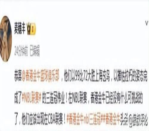 恭喜香港金牛籃球俱樂部 ,他們以99比72大勝上海玄鳥,以摧枯拉朽的姿態完成了#NBL聯賽# 的三連冠偉業!在NBL聯賽,香港金牛已經沒有什么可挑戰的了,他們應該出現在CBA聯賽!
