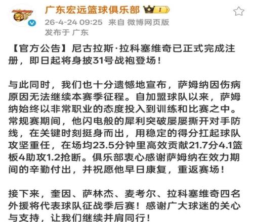 首先我們來看廣東男籃,目前拉科塞維奇已經跟隨球隊前往了廈門征戰最后一場對戰福建男籃的比賽,今天早上廣東男籃也是緊急為拉科塞維奇進行了注冊,并且發出了聲明,薩姆納由于傷病的影響,無法出戰這個賽季之后的比賽,所以拉科塞維奇是頂替了薩姆納的位置,廣東男籃這個賽季最后時刻將會以薩林杰、麥考爾、奎因以及拉科塞維奇來征戰這個賽季的季后賽,其實薩姆納的不打讓廣東男籃缺少了比較大的得分支援,好在目前麥考爾和奎因搭檔之下的狀態感覺也非常不錯,所以也是讓廣東男籃大膽的做出了最后的抉擇,也是希望薩姆納可以早日康復!