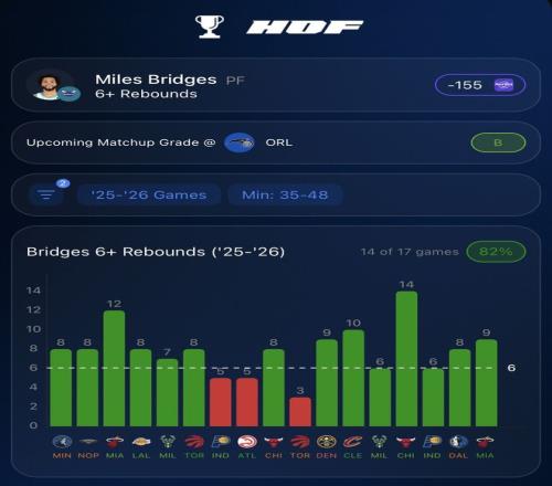 布里奇斯本賽季場均6.7籃板,表面看5.5門檻很低。但黃蜂4月16日打的是附加賽級別的"生死戰",對手針對性防守、犯規麻煩、垃圾時間壓縮都可能讓數據偏離預期。