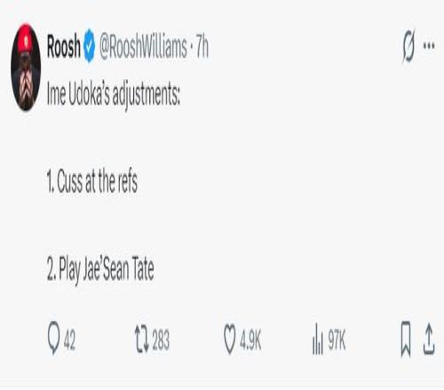 休媒Roosh寫道:這就是烏度卡的調(diào)整,1.對(duì)著裁判罵罵咧咧;2.重用杰肖恩-泰特。