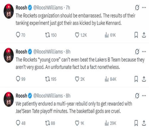 休媒Roosh繼續(xù)開噴:火箭隊(duì)管理層應(yīng)該感到羞愧不堪,他們‘拼命掙扎’策略的實(shí)驗(yàn)結(jié)果竟然被肯納德打得一敗涂地。火箭的年輕核心們甚至連湖人二隊(duì)都打不贏,因?yàn)樗麄冇矊?shí)力實(shí)在是太差了,這是一個(gè)遺憾的事實(shí),但卻是事實(shí)。