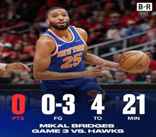 因為打得太糟糕,布里奇斯G3整個下半場只打了4分51秒,期間尼克斯凈負老鷹11分。全場下來,布里奇斯的正負值是-26——是的,在一場分差只有1分的比賽,相當于他不在場的27分28秒時間里,尼克斯凈勝老鷹25分。