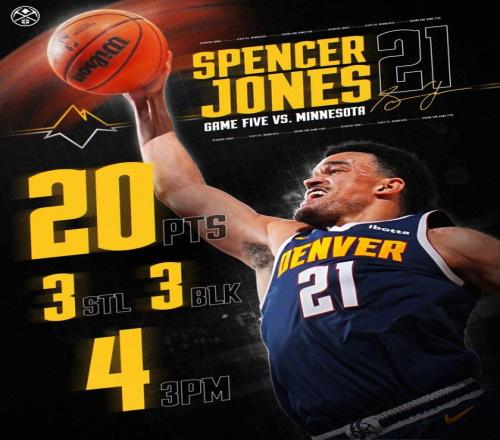 掘金隊虎將斯潘塞瓊斯,在此戰表現驚艷。斯潘塞瓊斯登場37分鐘,9投7中,三分5中4、罰球2中2,怒砍20分3籃板1助攻3搶斷3蓋帽的全能數據,只有1次失誤,正負值+13高居全場第三。斯潘塞瓊斯以77.8%的超高命中率砍下了全隊的第三高分,很好的分擔了約基奇、穆雷的進攻重任。并且,斯潘塞瓊斯還以80%的命中率轟進了全場最多的4記3分球。
