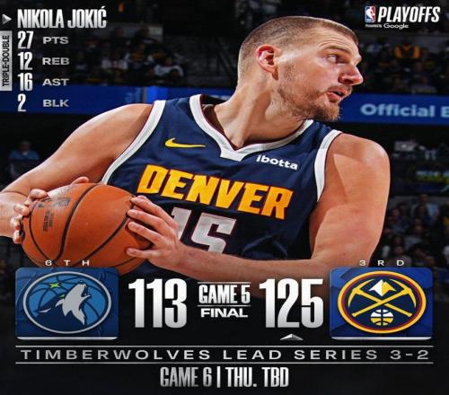 香農連投帶罰得到6分,約基奇助攻卡梅隆約翰遜暴扣,貝蘭熱2罰全中,卡梅隆約翰遜外線打鐵。布勞恩搶斷貝蘭熱,約基奇拋投得分,香農跳投得手還以顏色。比賽時間走完,最終,掘金以125比113力擒森林狼,得以將大比分改寫為了2比3,雙方的G6對決將在明尼蘇達主場進行。
