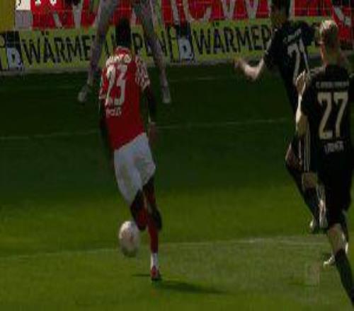 上半場補(bǔ)時第2分鐘,謝拉爾多·貝克爾補(bǔ)射破門,美因茨3比0領(lǐng)先。