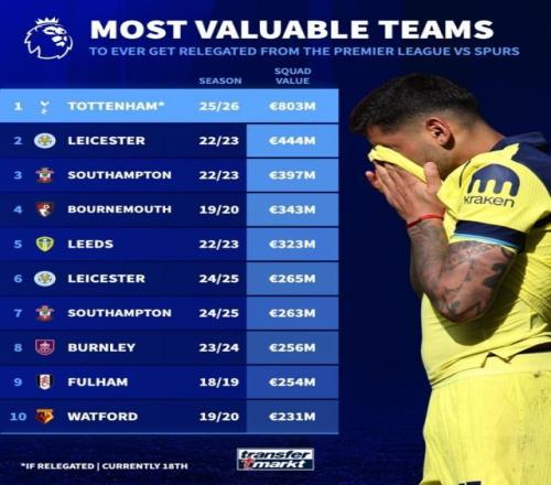 熱刺與降級球隊身價排名: