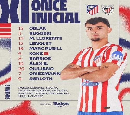 馬競首發:13-奧布拉克、3-魯杰里、14-馬科斯-略倫特、15-朗格萊、18-馬克-普維爾、6-科克、8-巴勃羅-巴里奧斯、10-巴埃納、20-朱利亞諾-西蒙尼、7-格列茲曼、9-瑟洛特