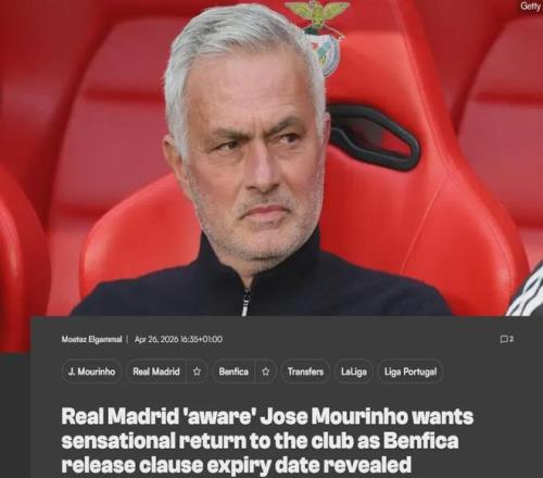 據悉,穆帥和本菲卡的合同中有終止條款,在特定的時間范圍內,穆里尼奧甚至可以免費離隊,而該條款將在本菲卡踢完本賽季的最后一場比賽的10天后到期,也就是大約在5月中旬。