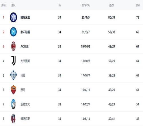 在積分榜上,國際米蘭依然排名榜首遙遙領先。國際米蘭25勝4平5負的戰績,拿到79分。排名第2的是那不勒斯,21勝6平7負,只拿到69分,足足落后國際米蘭10分。國際米蘭下一輪贏球就能夠提前奪得聯賽冠軍。AC米蘭只拿到1場平局,總積分是67分,排名第3。尤文圖斯則是64個積分,排名第4。第5的是科莫,拿到61分。羅馬也是61分,排名第6。第7的是亞特蘭大,只拿到54分。