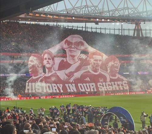 阿森納球迷賽前制作展示的巨大tifo:見證歷史。值得開心的是,槍迷確實見證了歷史,球隊連續兩個賽季殺進了半決賽...