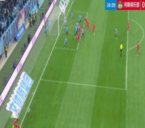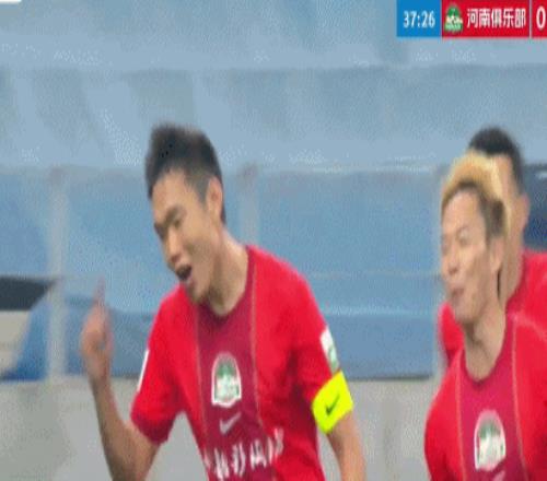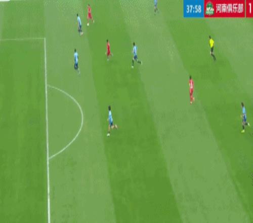 第38分鐘,呂焯毅禁區內解圍失誤,王上源得球晃開角度勁射破門,河南隊取得領先。王上源的這次射門,足足穿透了5名防守球員。