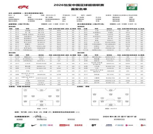 北京時間4月25日19:00,中超第8輪,成都蓉城主場對陣浙江。賽前首發公布。